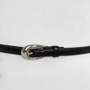 Brighton skinny leather belt in a classic black croc-embossed finish. This stylish accessory features a silver-tone western-style buckle with intricate etching and is accented by several silver-tone heart-shaped conchos along the strap. The interior is lined with tan leather and stamped with the Brighton logo and model number B10293. Perfect for adding a touch of Americana or boho-chic flair to jeans or dresses.