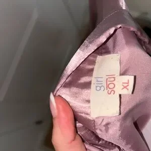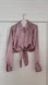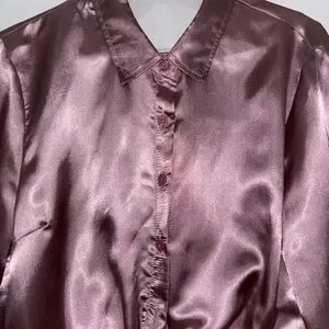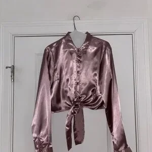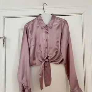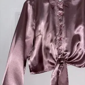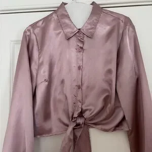 Chic satin long-sleeve blouse in dusty rose with a front tie. Lightweight, smooth fabric for a polished look. Button-front closure and pointed collar add classic style. Ideal for dressing up or pairing with jeans for a casual outfit.