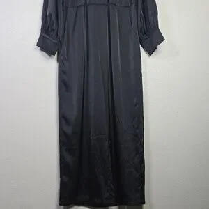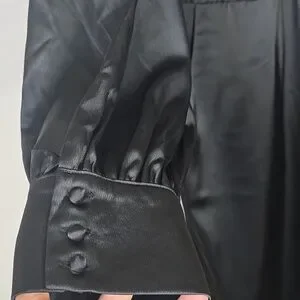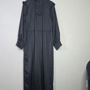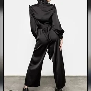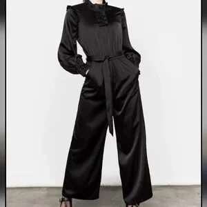 Elegant black jumpsuits long sleeves and ruffle-trim details. Lightweight, smooth fabric. Ideal for formal occasions or refined everyday styling.