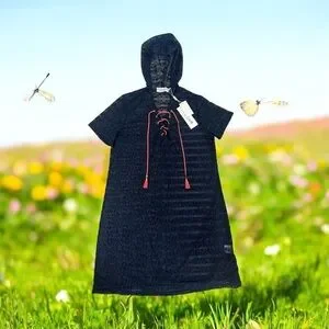Blue lace cover up dress featuring a hood and pink lace-up details. Perfect for a stylish look at the beach.