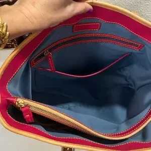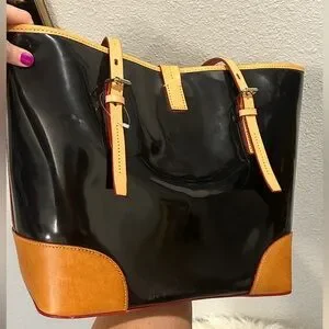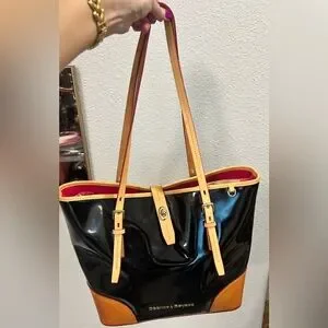 Dooney & Bourke Sleek black patent tote with tan leather straps and bright pink interior lining. Easy top-closure with center strap for added security. Structured design that complements both casual and polished looks. Lightweight and versatile for everyday use. Large 13 wide 12 Hieght . Used twice