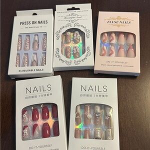 Elegant press-on nail sets in pink and nude tones. Easy-to-apply reusable nails with decorative accents for a polished look. Includes a variety of pink and nude designs to suit everyday and special occasions.