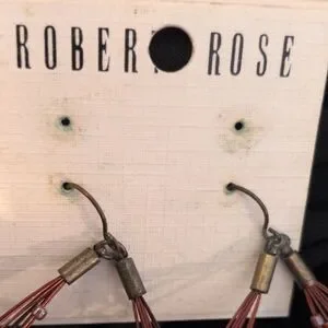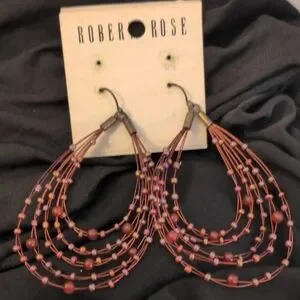 Draped multi-strand hoop design with layered beads. Lightweight and eye-catching movement. Hook closures for easy wear. Feminine rose-pink tones with subtle metallic accents.