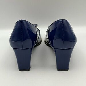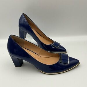Chic and polished Andrew Geller pumps in a rich navy patent leather. These elegant heels feature a modern block heel for comfort and stability, a sleek pointed toe, and a sophisticated gold-tone accent across the vamp.