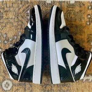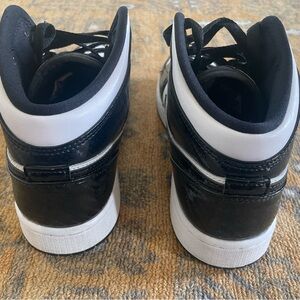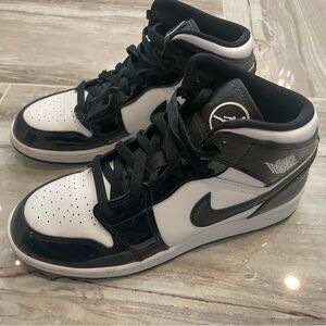 Nike Air Jordan 1 Mid SE “All-Star 2021” in black/white. Style DD2192-001, size 7Y (Youth/GS). These also fit a women’s size 8.5M. These are a standout pair — black patent leather overlays contrast against a white leather base, with a faux carbon fiber print on the Swoosh, heel, and collar flap. Wings logo on the side, Jumpman on the tongue, and encapsulated Air in the heel for cushioning. Great condition — no major flaws, soles clean, uppers shiny and intact. A limited All-Star Weekend release that’s hard to find in this size! Any questions, just ask. Fast shipping. 5 star seller.