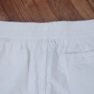 High-rise white corduroy shorts with a soft textured fabric for comfortable wear. Elastic back waist. Features front pockets and a secure button closure for easy styling. Clean, versatile creamy white pairs well with casual or dressed-up tops.