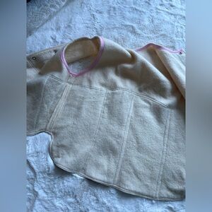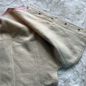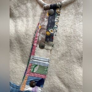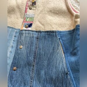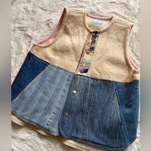 Sleeveless patchwork vest with denim front panels and cream wool body. Pink trim along armholes and neckline. Snap front closure and decorative center placket. Stylish layered look for casual wear. This is a one of kind, handmade in Seattle vest. So so cool but never wear and kinda big for me. Amazing