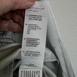 Soft, silky Abercrombie & Fitch blouse in a muted sage green tone with a romantic, flattering silhouette. Features a deep V neckline with adjustable tie front and flowy peplum hem.