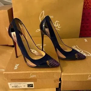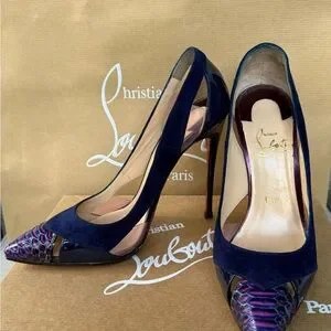 Christian Louboutin heels, designer stilettos, luxury shoes, red bottom heels, exotic leather pumps, watersnake heels, pointed toe stilettos, navy suede heels, high heel pumps, Louboutin size 37, US 7 , sexy heels, evening shoes,luxury fashion, statement heels, rare Louboutin, authentic Louboutin
