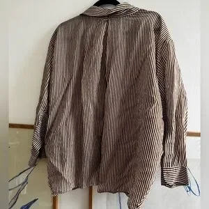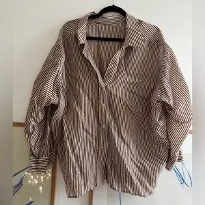 Stylish button-down shirt with brown and white stripes. Features a classic collar and long sleeves. Perfect for casual or formal wear.