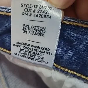 High-rise denim shorts with scalloped white eyelet ruffle hem. Classic blue wash with subtle whiskering. Feminine and playful detail. Easy to style for warm days. waist 14.5 rize 10inseam 6 lenght 14