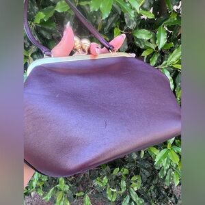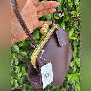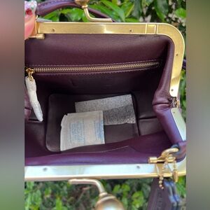 Gorgeous Coach Kisslock Frame Bag in rich Black Currant (deep burgundy) leather with a vintage-inspired silhouette. Features a structured frame with gold-tone kisslock closure and a top handle for an elegant, timeless look.
