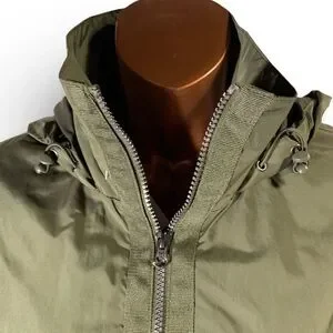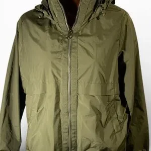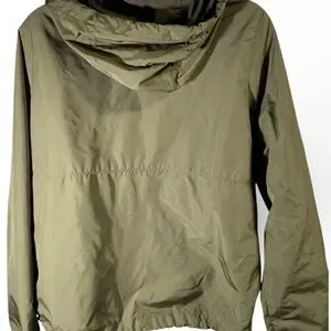 Lightweight olive windbreaker. Features a hood and zip closure. Ideal for outdoor activities.
