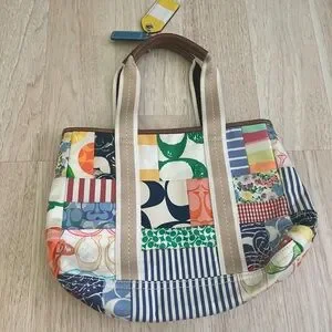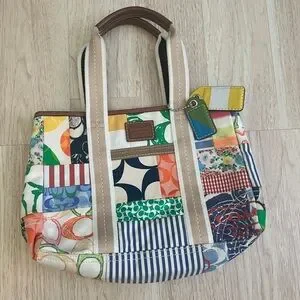 Patchwork Coach tote featuring mixed patterned canvas panels. Dual tan webbed top handles with leather trim. Colorful leather tag and Coach logo patch accent the front. Casual, eye-catching design for everyday use.