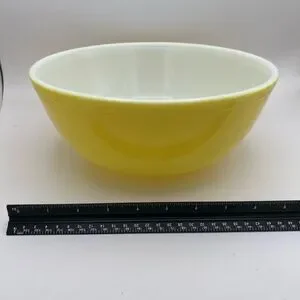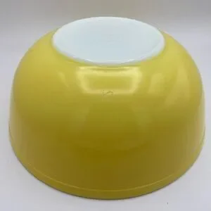 This is the iconic Primary Yellow nesting mixing bowl, the largest in the original 400-series set. A mid-century kitchen essential, this #404 bowl features a vibrant yellow exterior and a clean white opal glass interior. Based on the backstamp—featuring "PYREX" in all caps and the "Made in U.S.A." mark—this piece dates from the mid-1950s to early 1960s.