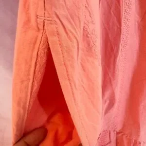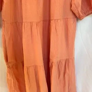 Soft peach midi dress with tiered skirt. Puff sleeves and elastic neckline. Relaxed, breezy silhouette. Casual and easy to wear. Some flaws in the bottom of the dress.