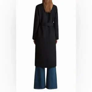 From its commanding peaked lapels to the self-tie belt, this longline, double-breasted coat turns refined tailoring into an everyday ritual in a rich wool blend. The unlined design removes bulk yet maintains heat and the pickstitch finish gives the edges a crisp atelier-defined frame.