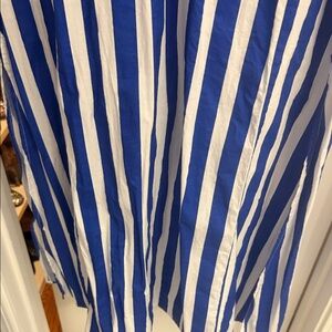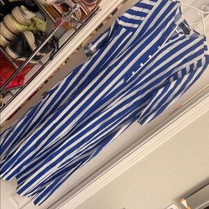 Lightweight blue and white striped swim cover-up. Designed for easy on-and-off over swimwear. Breathable fabric keeps you comfortable in warm weather. Relaxed fit with three-quarter sleeves for effortless beach style. Blue and white stripes add a fresh, nautical look.