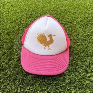 This eye-catching Tucker hat combines a vibrant pink and white color scheme with a striking rooster design on the front panel. The adjustable snapback style ensures a comfortable fit, while the curved brim adds a classic touch to this standout accessory.