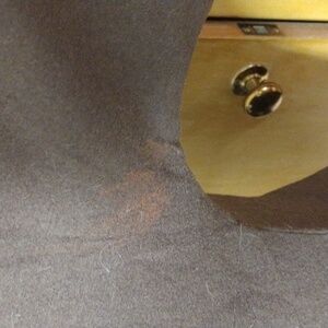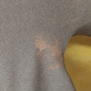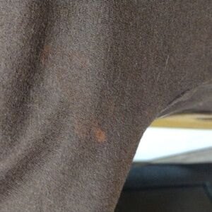 there is some fade in the underarms which is not noticable when worn. see photos. there's a little spot on the back of the sleeve too that I don't think is too noticable but is there when worn.