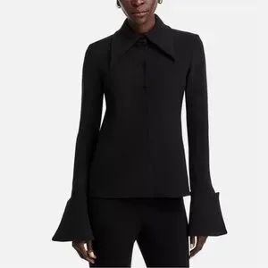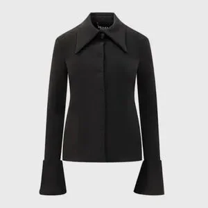 Structured shirt by A.W.A.K.E. Mode in black. Features a sharp oversized collar, clean hidden front closure, and exaggerated cuffed sleeves for a strong architectural silhouette.