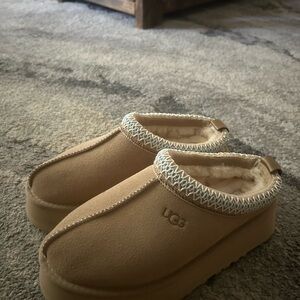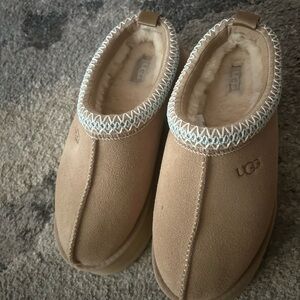 Soft beige suede slip-ons with plush interior. Features UGG logo and decorative trim.