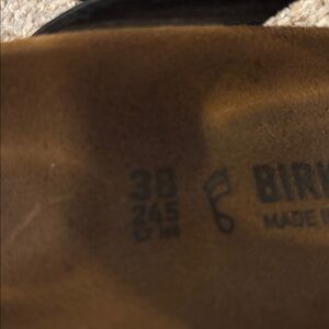 Stylish Birkenstock sandals with black straps. Features a comfortable brown footbed. Ideal for everyday wear. Size 38 or US 7