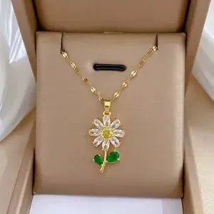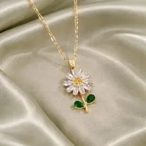 Charming necklace with a floral pendant. Gold chain with green leaf accents. Ideal for a stylish touch.