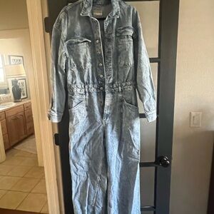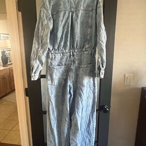 Casual denim jumpsuit with button closure. Long sleeves and chest pockets. Relaxed fit.