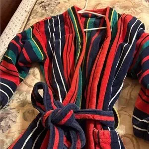 Cozy striped terry robe. Bold navy, red and green stripes with white accents. Tie waist for adjustable fit. Soft, absorbent texture. Great for lounging. Perfect condition. No rips, tears, or stains. Depending on height robe hangs to about the knee.