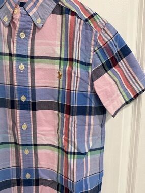 Classic Polo Ralph Lauren boys short sleeve button-down in a soft blue, pink, and multicolor plaid pattern. Features a button-down collar and signature embroidered pony logo. Lightweight cotton for all-day comfort—perfect for school, spring/summer, or dressy casual occasions. Boys size 8, great condition.