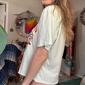 Fun Disney tee with Mickey & Friends. Colorful design on light green fabric. Perfect for fans.
