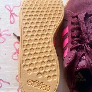 Women’s Adidas tennis shoes in a rich maroon velvet finish with bright hot pink stripes for a fun pop of color. The maroon tone may appear darker in photos, but they have a soft velvet texture that gives them a stylish, standout look. Comfortable and sporty—perfect for casual wear. In good condition.