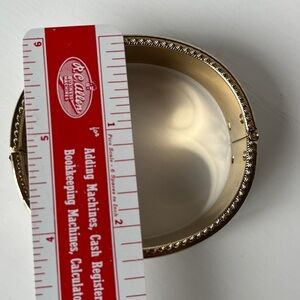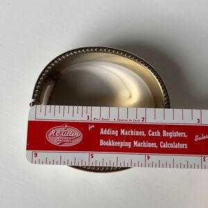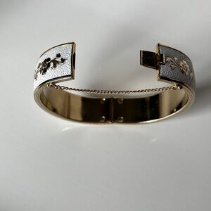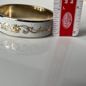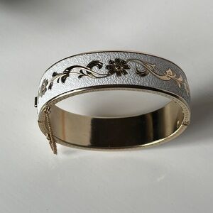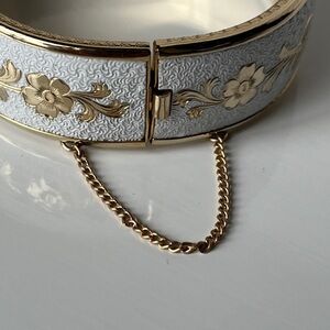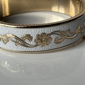 Vintage bangle bracelet gold tone floral scroll with white enamel hinged bracelet. In great vintage condition.