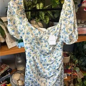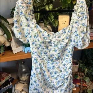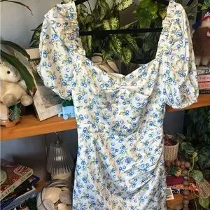 Chic mini dress with puff sleeves. Features a blue and white floral design. Perfect for stylish outings.