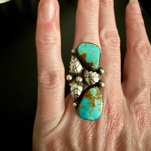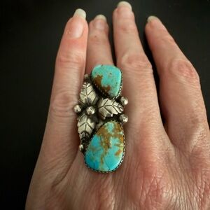 Gorgeous vintage rare Navajo (Dinè) ring set with two natural (likely Royston) turquoise stones in sawtooth bezels and a triple leaf design in Sterling Silver. The ring is a size 5.25 and part of my personal collection of vintage Native American jewelry. This piece likely dates to the 60s or 70s. Very eye-catching ring; I’m only selling it because it doesn’t fit me right anymore so I can’t wear it in the finger I want it on. Vintage patina left in place. Unsigned, which is common for older Navajo pieces. In excellent vintage condition.