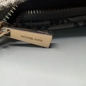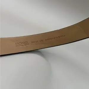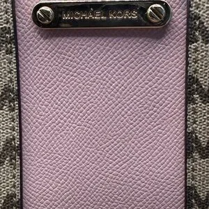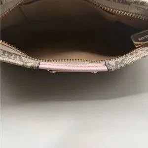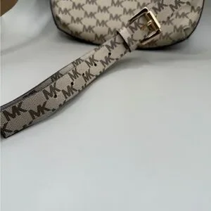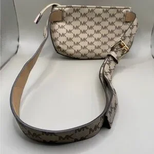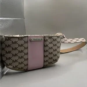 Size L/XL Michael Kors belt bag. Light brown background with brown MK logo print and pink center stripe. Bag measures approximately 9” wide x 5” high. Excellent used condition with no visible flaws. Interior is very clean.