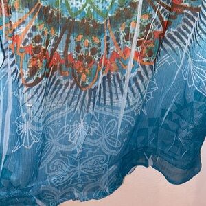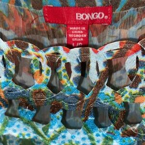 This top is a women's sheer blouse from the brand Bongo, featuring a vibrant, bohemian-inspired aesthetic.