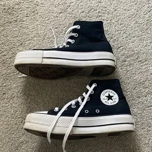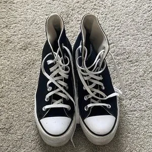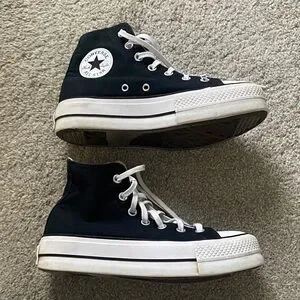 Stylish platform Converse high-tops in black with white details. Features classic logo patch and durable design. There are some scuffs and stains on the platform and the toe of the shoe (see pictures above), and some marks on the shoe laces from the metal rings they go through. Still have so much life left in them!!