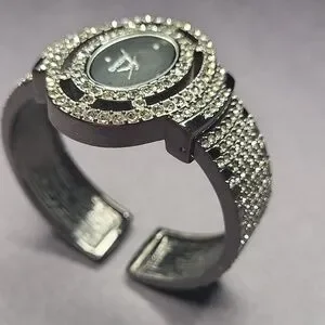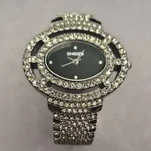 Chico's watch with a black dial. Surrounded by sparkling silver crystals. Elegant and eye-catching design. Working. No missing rhinestones.