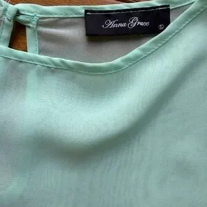 Soft and feminine Anna Grace mint green blouse featuring a lightweight sheer overlay and layered hem for a flowy, flattering silhouette. The airy fabric and pastel tone make it perfect for spring and summer styling.