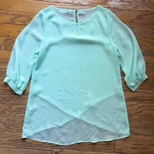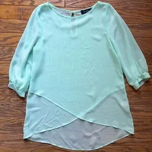 Anna Grace Mint Green Sheer Blouse with Layered Hem - Size L