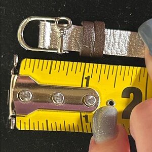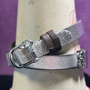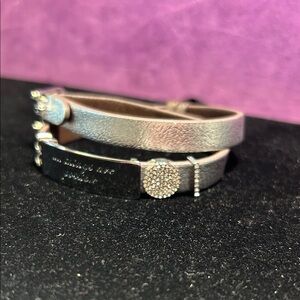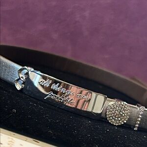 Very gently worn. A beautiful silver high quality leather wrap bracelet. The pave settings really help this beauty shine big time!! Slide charms include an engraved inspirational plate reading "all things are possible,” two hearts, a pave circle & a pave strip! Check out the lovely key inspired buckle. Two free sliding leather straps allow for a variety of closing options. Stylish, wearable accessory that pairs well with casual or dress looks.