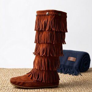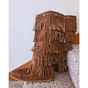 Minnetonka 5 Layer Fringe Boots Womens 8 Brown Suede Tall Zip Moc