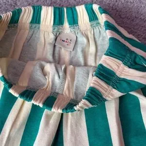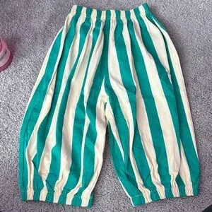 Comfortable kids bottoms with bold green and cream vertical stripes. Elastic waistband and hem for a snug, flexible fit. Soft, breathable fabric for all-day play. Stylish stripe pattern that pairs easily with solid tops.