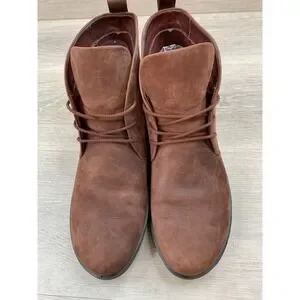 ECCO Hydromax lace-up ankle boots offer a blend of weather-resistant performance and modern style. Crafted with a rich brown nubuck leather upper, these chukka-style boots feature the brand's signature Hydromax water-repellent treatment to keep feet dry in damp conditions. The design includes a comfortable wedge heel and a durable synthetic outsole with excellent grip. A pull tab at the heel and a soft interior lining ensure ease of wear and all-day comfort for various outdoor activities or casual urban outings.