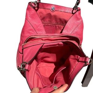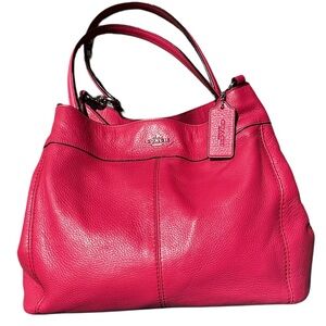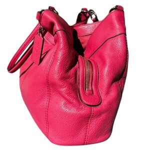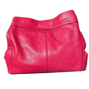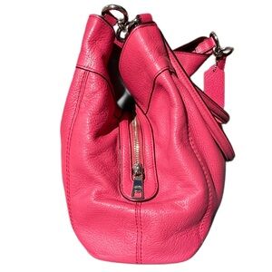 Coach Lexi pebbled leather shoulder tote in vivid hot pink. Double straps for easy carrying. Coach logo plaque and hangtag detail. Spacious open-top design with soft butter structure. Silver hardware, shoulder bag. Pre owned slouchy design, in good condition. See photos as they’re part of the description.