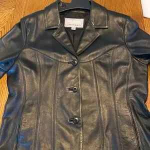 Genuine leather black jacket with stylish seaming details. In very good condition with no observable stains, rips, etc. There is a slight smell to the jacket. I think it may be mothballs? It was much stronger when I got the jacket at an estate sale but I let the jacket dry soak in baking soda for a couple of days and it is much fainter now.