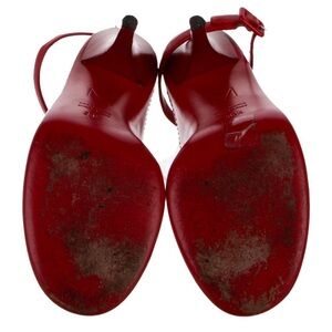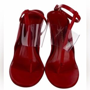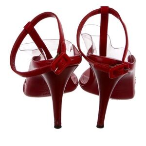 Beautiful pair Tamara Mellon red alert sandals featuring a clear PVC strap and stiletto heel