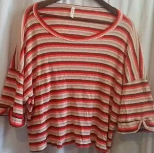 Lightweight striped knit top in coral and cream. Relaxed fit with a flattering scoop neckline. Soft, breathable fabric for all-day comfort. Versatile style that pairs easily with jeans or skirts.